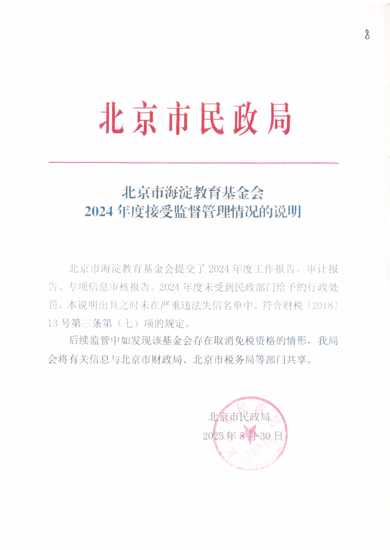 北京市海淀教育基金会2024年度接受监督管理情况的说明